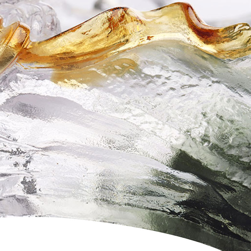 Trên những ngọn núi màu xanh đậm này, một con báo đen màu tím sẫm nhanh nhẹn, ngậm một chuỗi đồng xu màu hổ phách trong miệng. Những đồng tiền đồng ấm áp và trong mờ, tương phản với chiều sâu huyền bí của con báo đen và màu xanh đậm êm đềm của núi non, tạo thêm nét sống động và sang trọng độc đáo cho toàn bộ đĩa trái cây. Độ trong như pha lê của chất liệu thủy tinh làm cho khung cảnh này trở nên sống động, khiến nó trở thành một chiếc bình tinh xảo vừa có vẻ đẹp nghệ thuật vừa có giá trị thủ công. Dù là đĩa đựng trái cây thiết thực hay vật trang trí nghệ thuật, nó đều toát lên vẻ quyến rũ quyến rũ, thu hút sự chú ý và hấp dẫn.