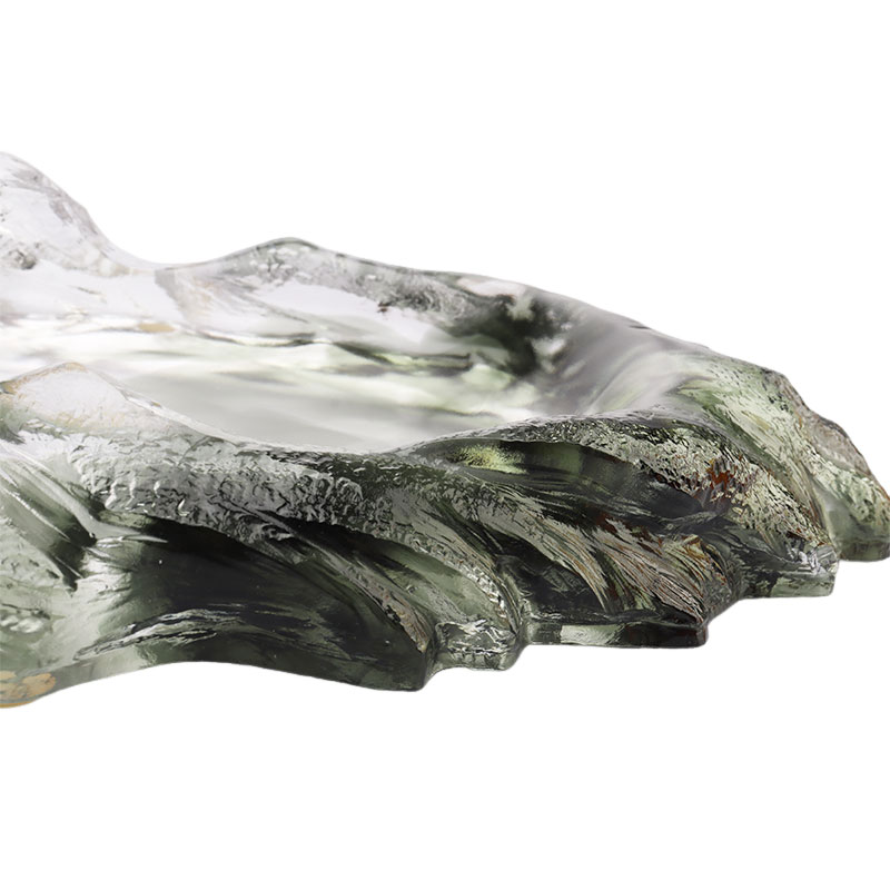 Đĩa đựng trái cây bằng thủy tinh này được chế tác cẩn thận bằng phương pháp sáp thất truyền cổ xưa. Đĩa đựng hoa quả có dạng đĩa hình bầu dục, có những dãy núi xanh đậm nhấp nhô tạo thành thân đĩa. Màu sắc của nó trầm tĩnh, như thể cô đọng lại độ sâu và sự huyền bí của núi rừng.